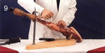 using a sharp knife - cut deeply into the ham alongside the fibula